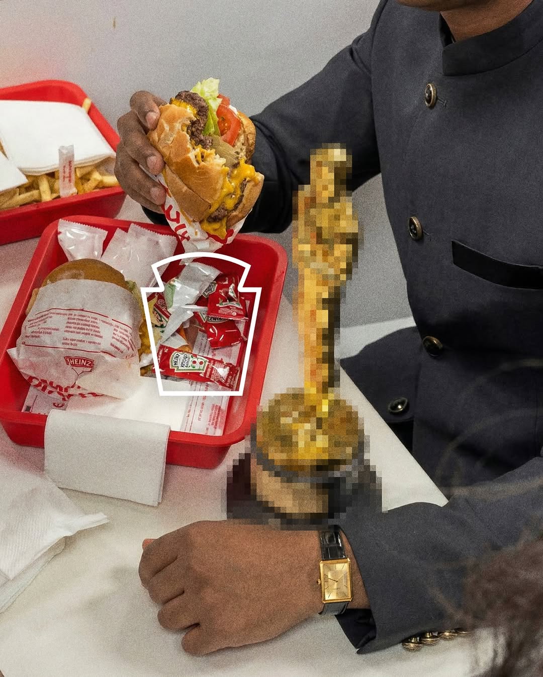 Na mesa, um detalhe: um sachê de ketchup Heinz. No dia seguinte, rapidamente publicaram um close da estatueta do Oscar ao lado de seus sachês.